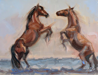 One cool, breezy morning I was out painting and watched several bands of horses come to the river. The breeze combined with the water made for playful interaction. This painting, "Stallion Moves" was based on what I saw that day. I was lucky enough to capture some of the action on video.